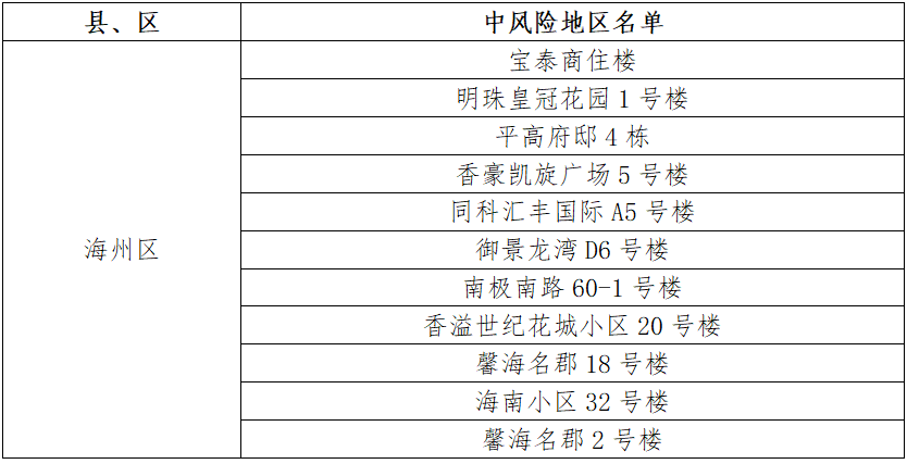 根據國務院聯防聯控機制有關規定,經市指揮部研究決定,自發布之日起,對我市部分區域疫情風險等級進行調整:海州區同科匯豐國際C10號樓、紫金公館3號樓、興業時代花園B6號樓、興業時代花園C6號樓、九龍城市樂園77號樓、明珠皇冠花園20號樓、華潤公寓、雙龍村澗西隊65號、眾興華庭10號樓、壹品國際C區、香溢世紀花城小區2號樓、明珠皇冠花園11號樓、小學路11-1號樓、兆隆城市洋房A號樓、振興小區2號樓、易居公館4號樓、浦潤花園4號樓由中風險地區調整為低風險地區。其他地區風險等級不變。調整后全市現有11個中風險地區。