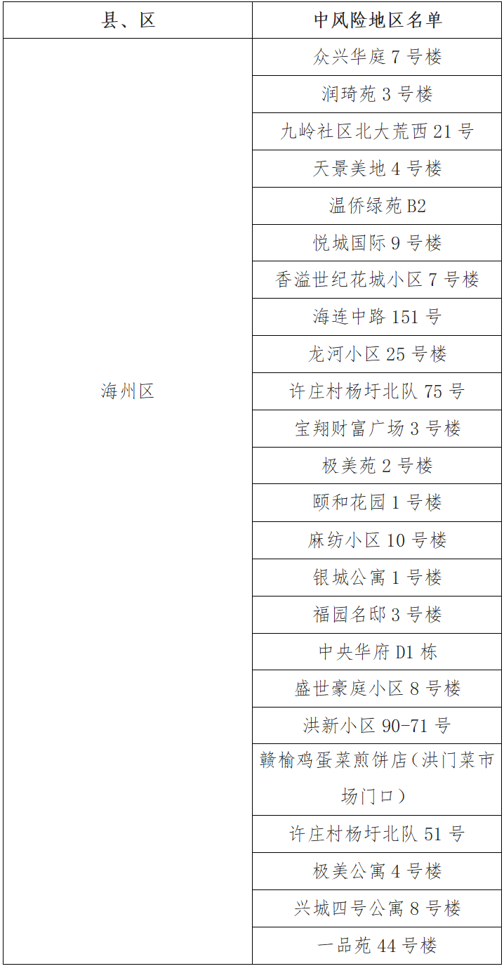 根據(jù)國務院聯(lián)防聯(lián)控機制有關規(guī)定,經(jīng)綜合評估研判,市指揮部決定,自發(fā)布之日起,將頤和花園1號樓、麻紡小區(qū)10號樓、銀城公寓1號樓、福園名邸3號樓、中央華府D1棟、盛世豪庭小區(qū)8號樓、洪新小區(qū)90-71號、贛榆雞蛋菜煎餅店(洪門菜市場門口)、許莊村楊圩北隊51號、極美公寓4號樓、興城四號公寓8號樓、一品苑44號樓調(diào)整為中風險地區(qū)。其他地區(qū)風險等級不變。調(diào)整后全市現(xiàn)有24個中風險地區(qū)。