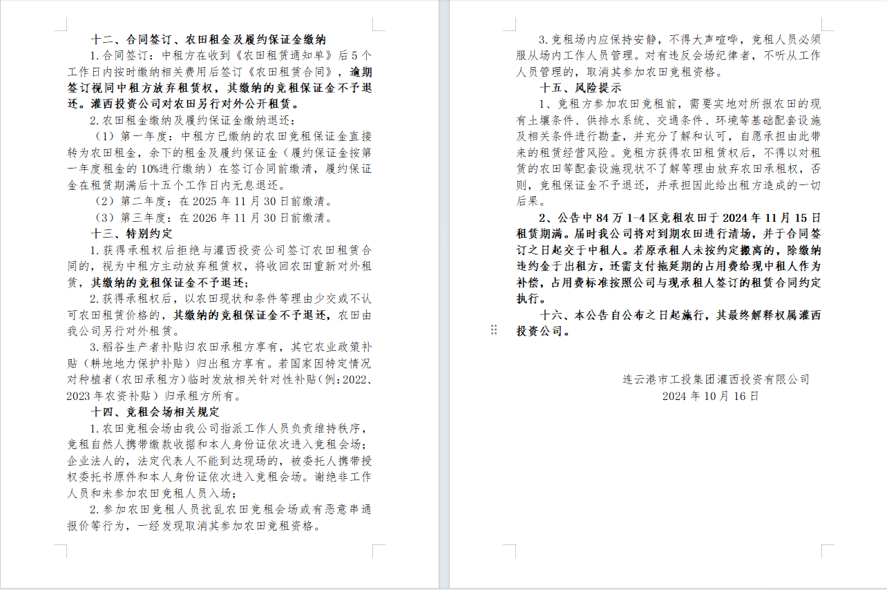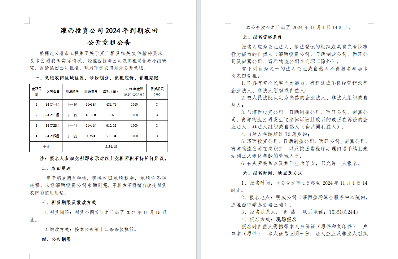 灌西投資公司2024年到期農田公開競租公告
