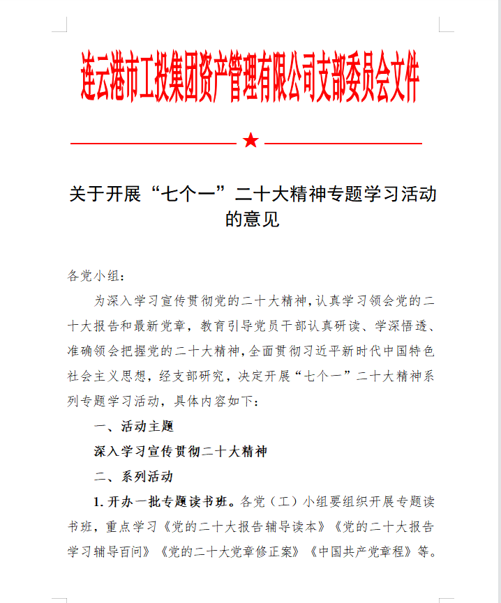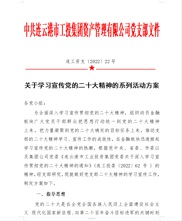 為在金融板塊快速掀起學(xué)習(xí)宣貫黨的二十大精神熱潮,支部精心組織、積極籌劃,完善學(xué)習(xí)方案,創(chuàng)新學(xué)習(xí)教育形式,豐富黨建活動載體,支部結(jié)合公司實(shí)際,專門制定《學(xué)習(xí)宣傳貫徹二十大精神學(xué)習(xí)方案》、《關(guān)于開展“七個一”二十大精神專題學(xué)習(xí)活動的意見》。