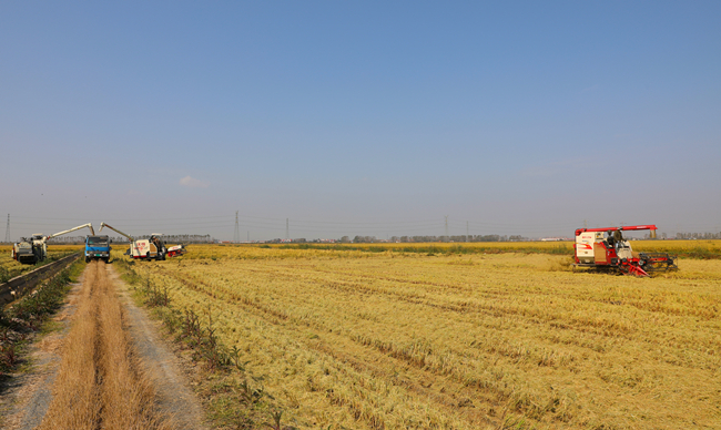 據了解,今日搶先收割的是今年引種的新品優質粳稻南粳58,試種面積大約100畝,具有南粳系列品種的柔、香、糯、白等優良食味特征。