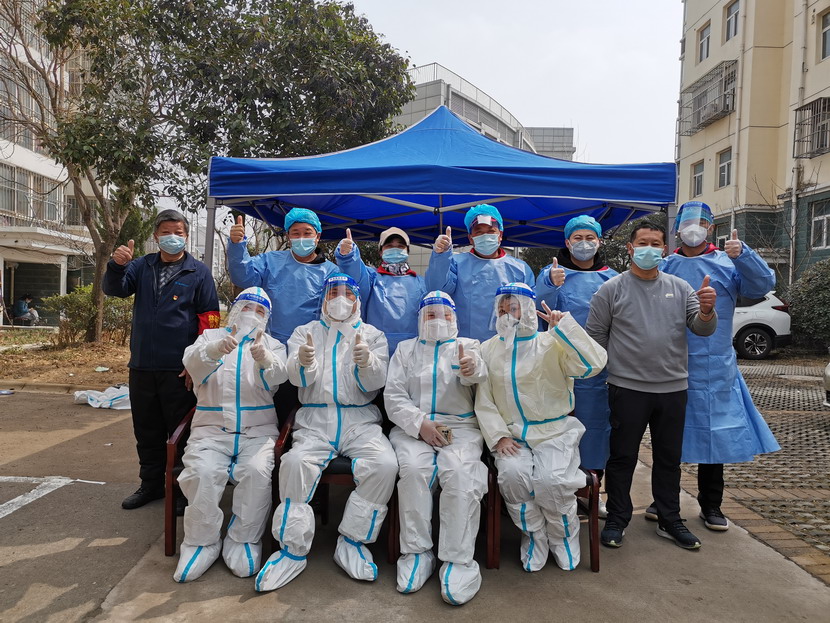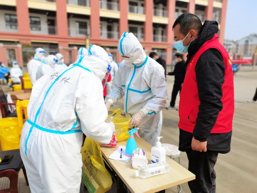 清晨6點30分,1號檢測點,李明同志在檢查物資,“大白”服裝4套、“小藍”服裝6套、棉簽600根……;2號檢測點,于洪亮在將物資上桌,病毒核酸檢測試管、棉簽、消毒液,“還缺少一瓶酒精,我立即反饋給社區,請社區抓緊安排送來”;4號檢測點,蘇玲、秦黎明正在互相幫忙穿好防護服,“秦姐,這個防護面罩里外有兩層薄膜,我給你撕掉,這樣就不會有霧氣了”,“嗯嗯,你這個拉鏈得拉到頂,我們自己也一定要做好防護”秦黎明溫柔的說;5號檢測點,內退黨員孫芳和姜海洋,互相在防護服后背寫上對方的名字,以便于更高效的完成檢測工作;6號檢測點,霍正鋼、朱文健、韓永剛、邱榮濱正在清點檢測小卡片;7號檢測點,張強在拿著酒精給廢物處置垃圾箱消毒;8號檢測點,新加入的孫銀、占恒春、尹永明、韓永光、趙紹慶正在給消殺噴霧劑灌裝84消毒液,社區8個檢測點的消殺工作全部由昌圩臨時黨支部志愿者負責。