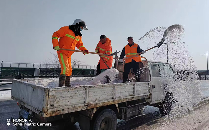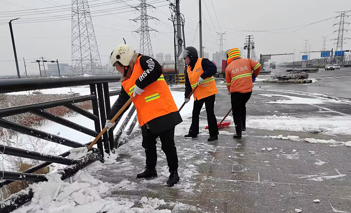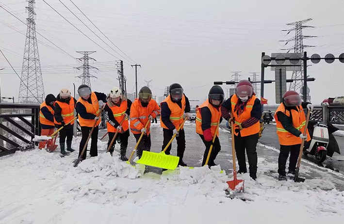 在白雪皚皚的雪地里,身穿橘黃工作服的保潔工人就是最美的點綴,他們頂著風雪吹打臉頰,兩人一組、三人一對,配合默契,揮動手中鐵銑,用力拋灑融雪鹽斤80多噸,10余車。道路橋粱兩側,人行輔道邊上,公司上下齊心協(xié)力,9名班長在公司統(tǒng)一調(diào)配下,帶領班組人員,人工清除大小橋梁兩側積雪30多座,人行輔道長達3000多米長,站臺、叉路口積雪100多處,為保障恢復雪后新城環(huán)境整潔而努力工作。大型清掃設備駕駛員全員齊上陣,安全行車裝運融雪鹽斤里程達200多公里,工作時長10個多小時,安全操作鋤雪機械清理張圩互通引橋,埒子口大橋等路段長達5000多米長,有力彰顯機械破冰、除雪強大功能。(楊波)