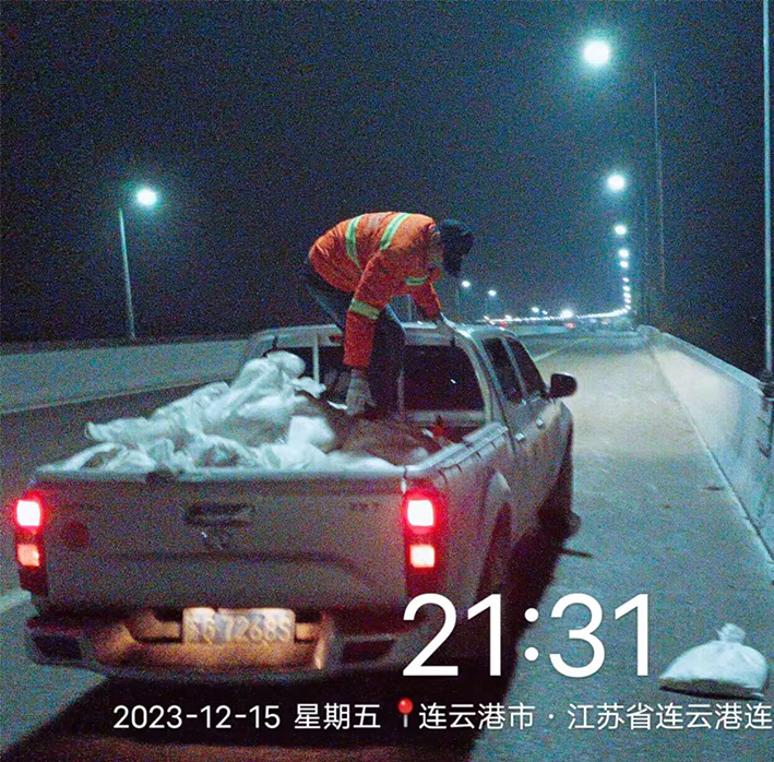 12月15日夜間21時左右,受寒潮影響,徐圩大地瞬間飄落鵝毛般雪花。為保障新城主要干道車輛、行人往來石化園區(qū)安全暢通經(jīng)過。保潔分公司結(jié)合徐圩城建與悅升公司冬季突發(fā)天氣處置預(yù)案,聞雪而動,第一時間啟動布放融雪劑工作,大橋兩側(cè)盡顯保潔人無懼嚴(yán)寒勞動場景。