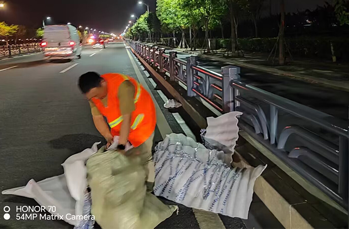 為及時有效排除道路突發障礙,保潔勇士無所畏懼,勇于擔當,第一時間趕赴道路車輛拋灑事發地段,用實干精神彰顯鹽場人愛崗敬業高尚風采。